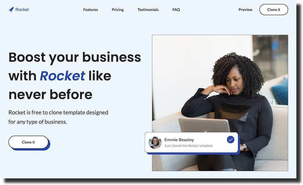 The @Flowout team designed the Rocket one-page landing page template. This creative, eye-catching, and easy-to-use template can instantly give life to your brand and increase conversions.